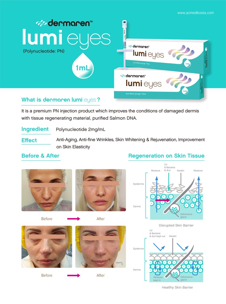 Sourced from purified salmon DNA (deoxyribonucleic acid 250-350 kDa), Lumi Eyes harnesses the power of PDRN 2mg/ml — a safe, biocompatible superstar that triggers deep cellular repair. It stimulates massive collagen and elastin production, rebuilds damaged DNA chains, restores volume, deeply moisturizes, brightens dark circles, and smooths fine lines for a naturally youthful, energized look.